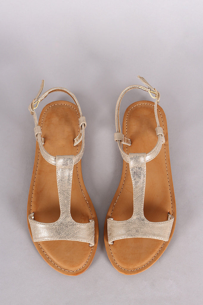 This open toe flat sandal features a T-strap construction, lightly padded insole, and adjustable ankle strap with buckle fastening.Material: Vegan Leather (man-made)Sole: Rubber