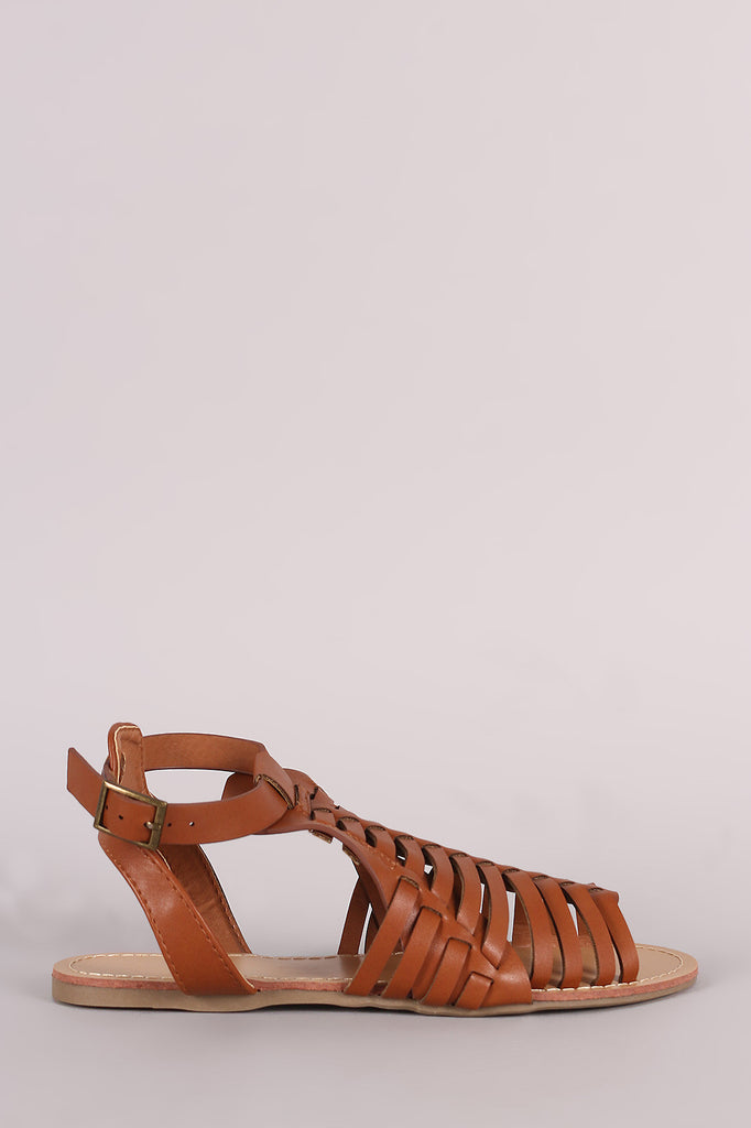 This delightful flat sandal features an open toe silhouette, woven design vamp, lightly padded insole, and adjustable ankle strap with buckle closure.Material: Vegan Leather (man-made)Sole: Rubber